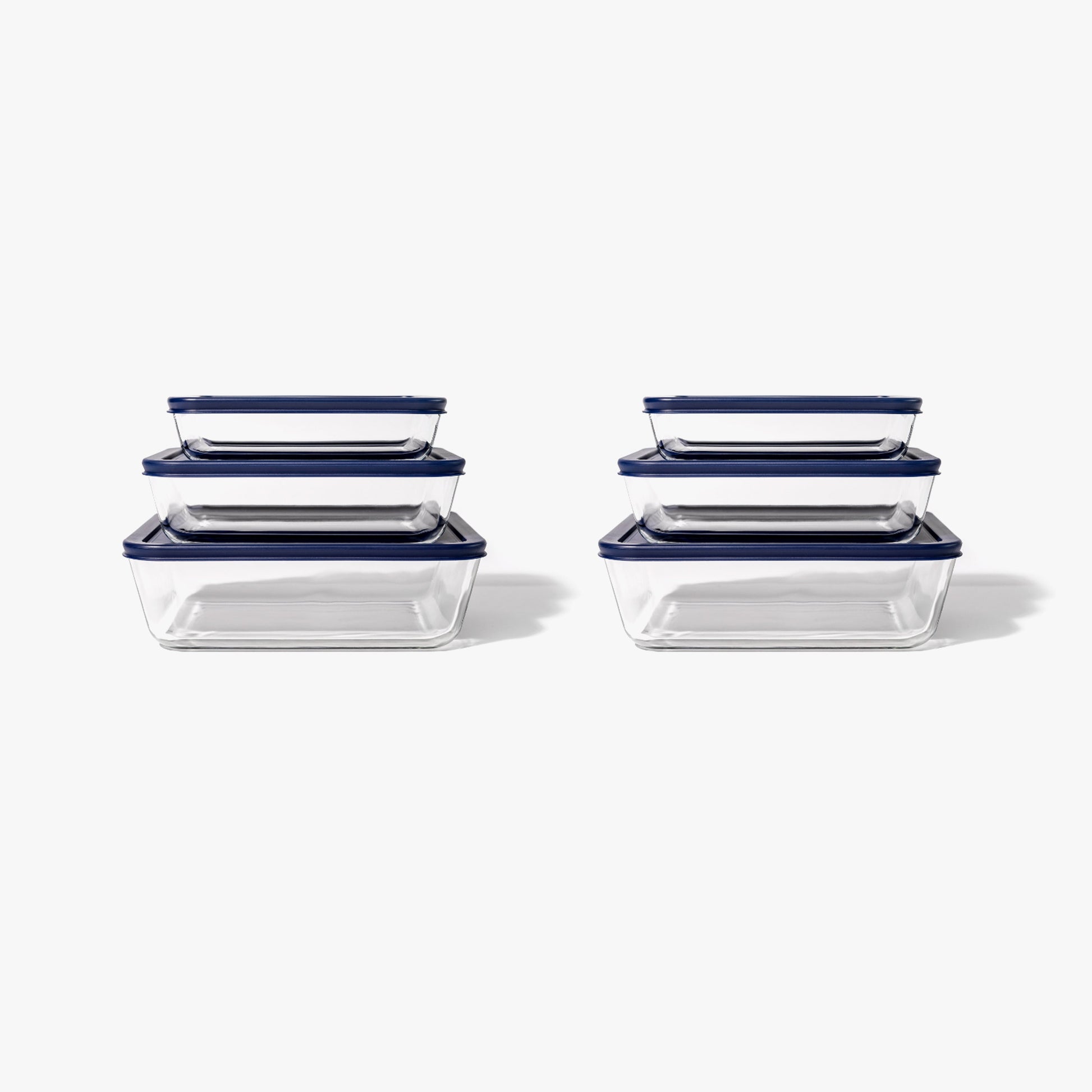 Glass Food Storage Containers - 12 Piece (6 Containers + 6 Lids) Rectangular Nesting Space-Saving Set